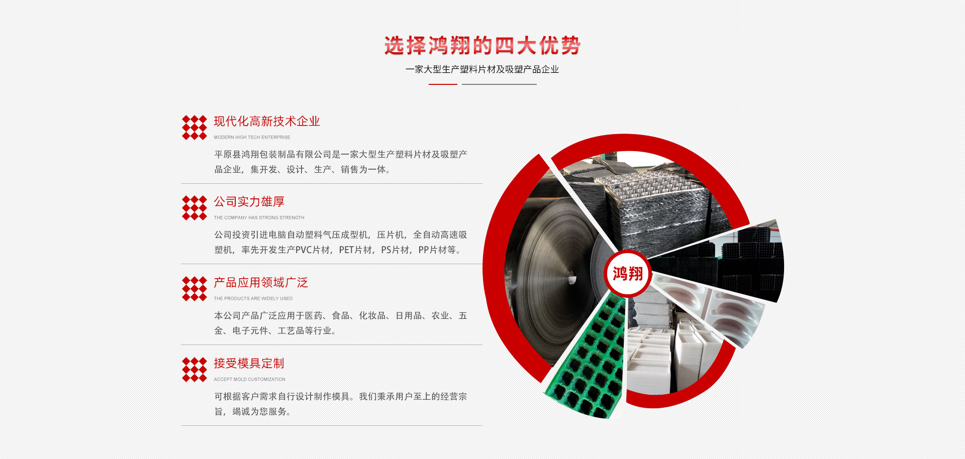 平原縣鴻翔包裝制品有限公司是一家大型生產(chǎn)塑料片材及吸塑產(chǎn)品企業(yè),本公司投資引進(jìn)電腦自動(dòng)塑料氣壓成型機(jī),壓片機(jī),全自動(dòng)高速吸塑機(jī),率先開(kāi)發(fā)生產(chǎn)PVC片材,PET片材,PS片材,PP片材等,鴻翔是國(guó)內(nèi)先進(jìn)的生產(chǎn)廠(chǎng)家之一。本公司產(chǎn)品廣泛應(yīng)用于醫(yī)藥、食品、化妝品、日用品、農(nóng)業(yè)、五金、電子元件、工藝品等行業(yè),也可根據(jù)客戶(hù)需求自行設(shè)計(jì)制作模具。本公司技術(shù)力量雄厚,生產(chǎn)設(shè)備工藝先進(jìn)。我們秉承用戶(hù)至上的經(jīng)營(yíng)宗旨,竭誠(chéng)為您服務(wù)。